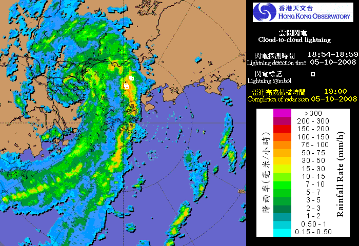 │回主頁│回到上頁│玉兔(2001)│黑格比(2002)│黃蜂(2002)│杜鵑(2003)│圓規(2004)│ ●上圖為海高斯移至南海時的衛星雲圖(按圖放大) ●上圖為二零零八年十月五日下午五時的雷達圖像(按圖放大) ●上圖為二零零八年十月五日的香港雨量分佈圖(按圖放大) 熱帶氣旋警告紀錄 1 所有警告取消 天文台相關資料 海高斯(0817)的報告